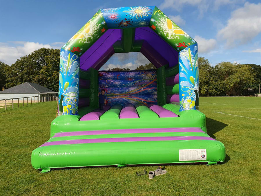Our celebration bouncy castle would be a great addition to any wedding, celebration or event. Suitable for adults and children of any age. This is our biggest bouncy castle at 19ft by 17ft.Available for indoor and outdoor use. Vibrant and bright design with a fitted shower cover. Also available for over night hire for an extra £30.