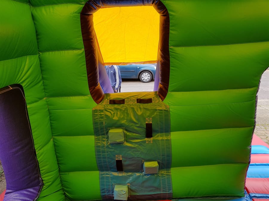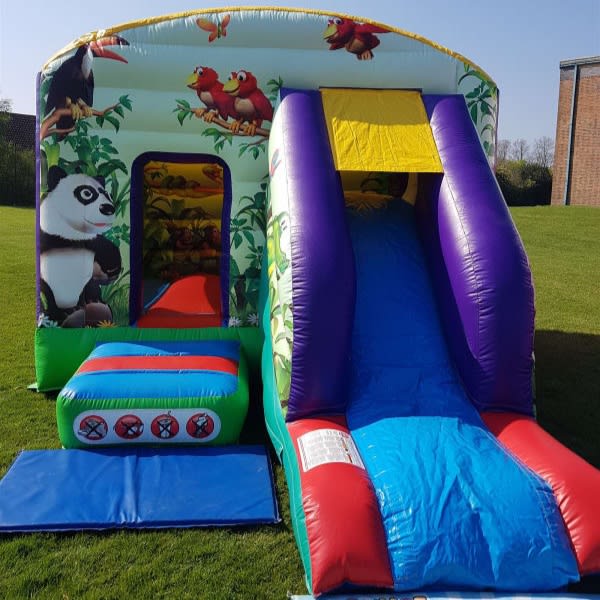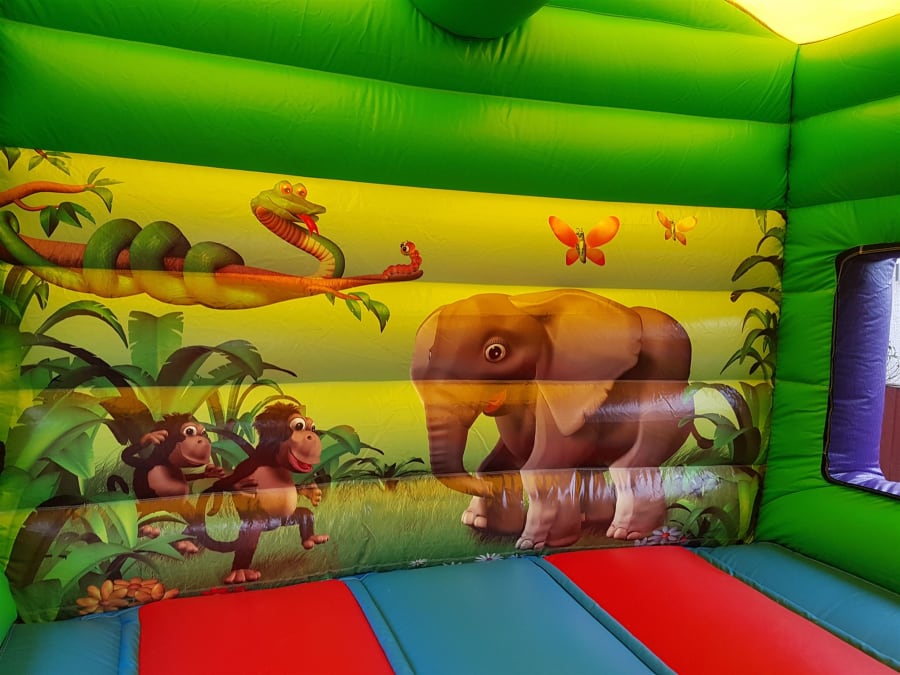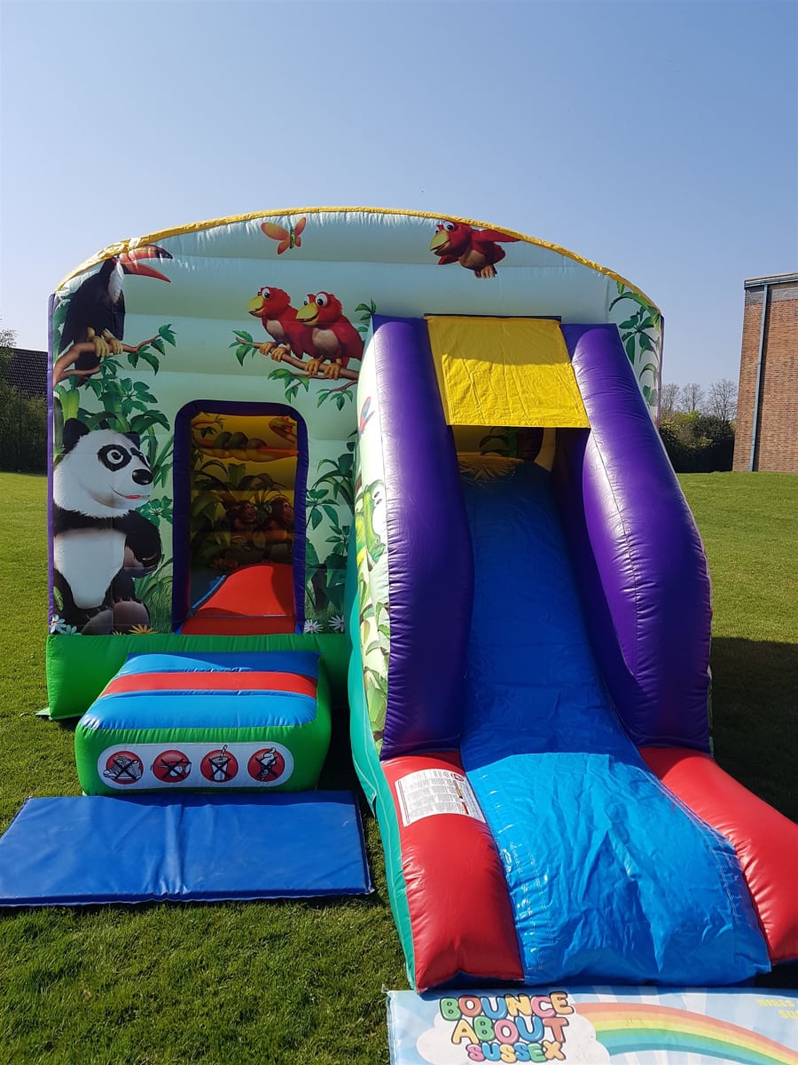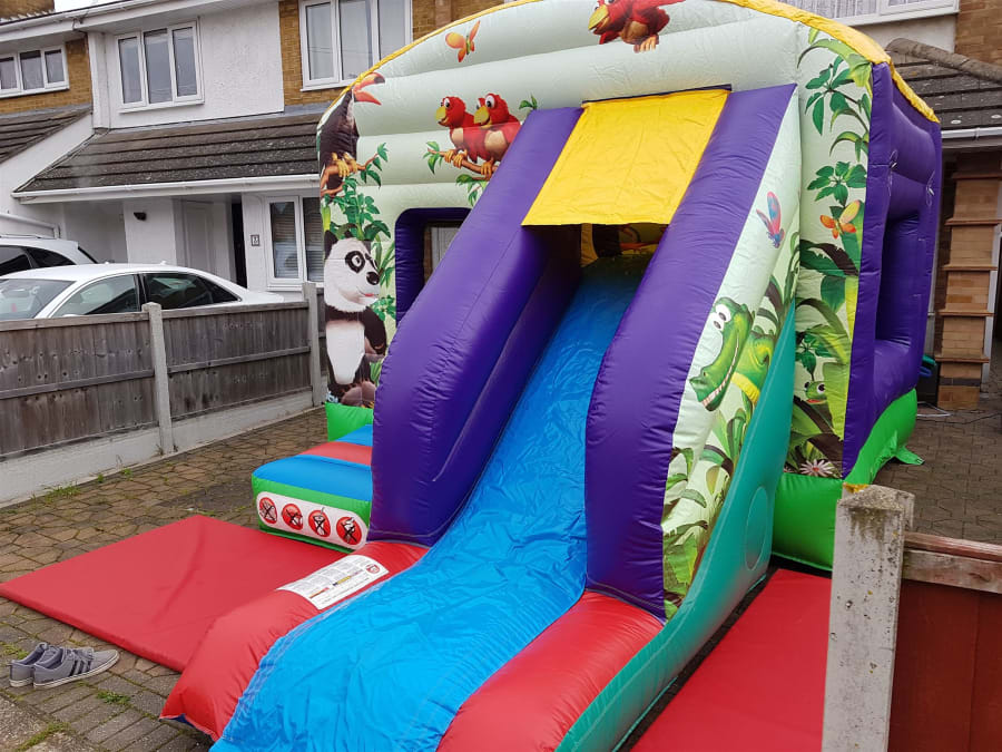 Jungle themed bouncy castle with a front slide for added extra fun. Suitable for boys and girls up to 1.8 meters. Fitted shower cover. Indoor and outdoor use. Available for over night hire for an extra £30. We will bring all the equipment needed with them. This will include the inflatable that you have hired, safety mats (where needed), pegs to hold the castle down outside on grass or sand bags for indoor use, extension leads, and an electric inflation fan. There must be access to a 240V mains power supply (general mains socket is fine) within 50 meters of the bouncy castle. Generators are an alternative where no electricity is available and are priced from just £30. Access Requirements: please note that a minimum of 3ft is required when moving the equipment through doorways and corridors. If you feel that access may be an issue, such as stairways or lift access, uneven surfaces, obstructions or perhaps long distances then please mention this in your enquiry.