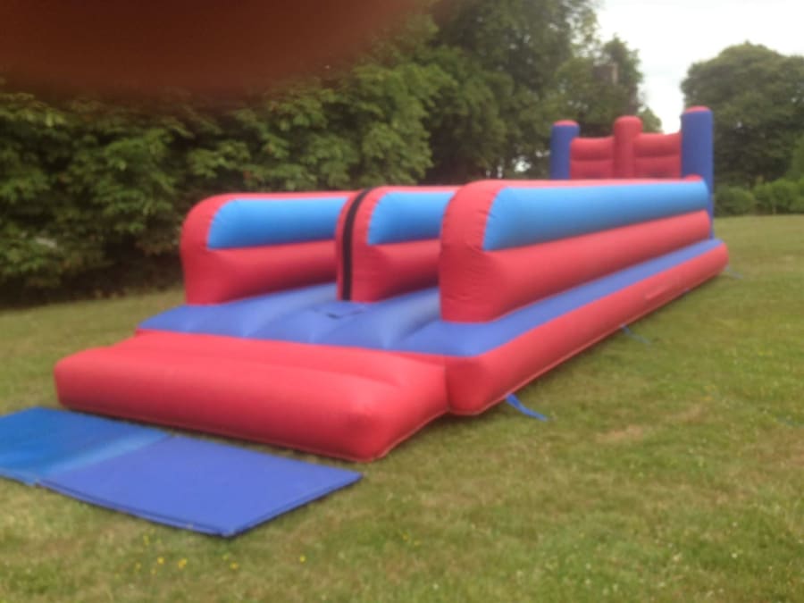 Here we have our red and blue bungee run a great head to head game, strap yourself onto our bungee cord and then run as far as you can to stick your token on the strip the one furthest is the winner.