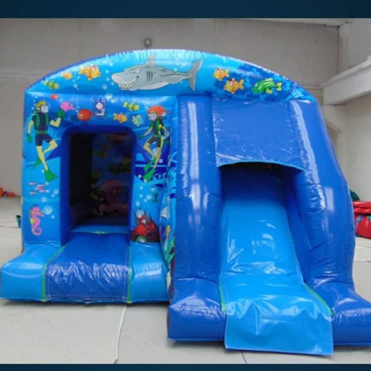 Under the sea themed bouncy castle with a front slide for added extra fun. Suitable for boys and girls up to 1.8 meters. Fitted shower cover. Indoor and outdoor use. Available for over night hire for an extra £40. We will bring all the equipment needed with them. This will include the inflatable that you have hired, safety mats (where needed), pegs to hold the castle down outside on grass or sand bags for indoor use, extension leads, and an electric inflation fan. There must be access to a 240V mains power supply (general mains socket is fine) within 50 meters of the bouncy castle. Generators are an alternative where no electricity is available and are priced from just £40. Access Requirements: please note that a minimum of 3ft is required when moving the equipment through doorways and corridors. If you feel that access may be an issue, such as stairways or lift access, uneven surfaces, obstructions or perhaps long distances then please mention this in your enquiry.