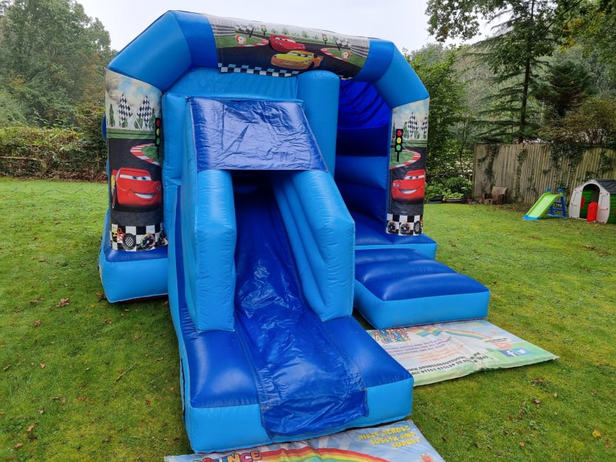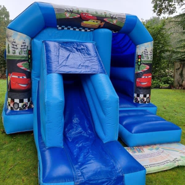 Here we have our cars themed bouncy castle great for all your little racers out there also has a front facing slide a great extra for any occasion.